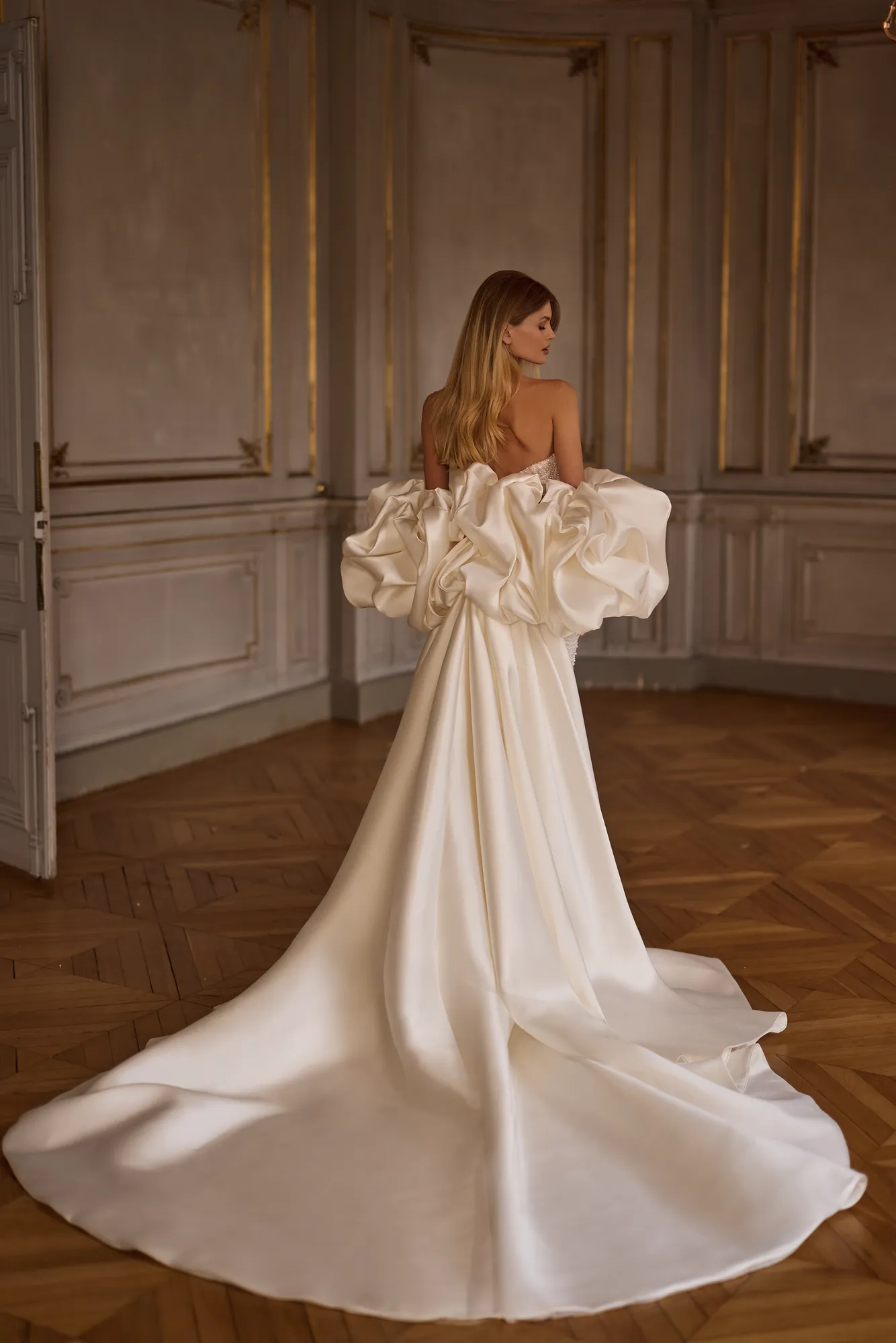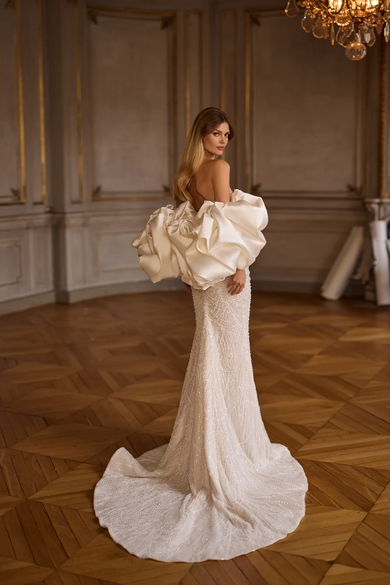 Das luxuriöse Fit & Flare Kleid ist aus Chantilly-Spitze gefertigt, die mit Perlen und Pailletten bestickt ist. Es hat einen Herzausschnitt und eine kleine Schleppe. Der Look kann mit einem voluminösen Umhang aus Mikado-Stoff ergänzt werden. Der Umhang hat prächtige Puffärmel und eine lange, abnehmbare Schleppe.