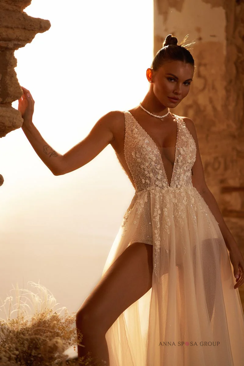 Akzente: atemberaubendes A-Linien-Kleid mit breiten Trägern. Das Oberteil des Kleides ist aufwendig mit Spitze, Perlen und Pailletten verziert, hat einen spektakulären V-Ausschnitt mit einem durchscheinenden Netzeinsatz und einen akzentuierten Ausschnitt auf der Rückseite. Ein leichter, halbtransparenter Rock mit hohem Schlitz ergänzt den Look und macht ihn sehr feminin und luftig.