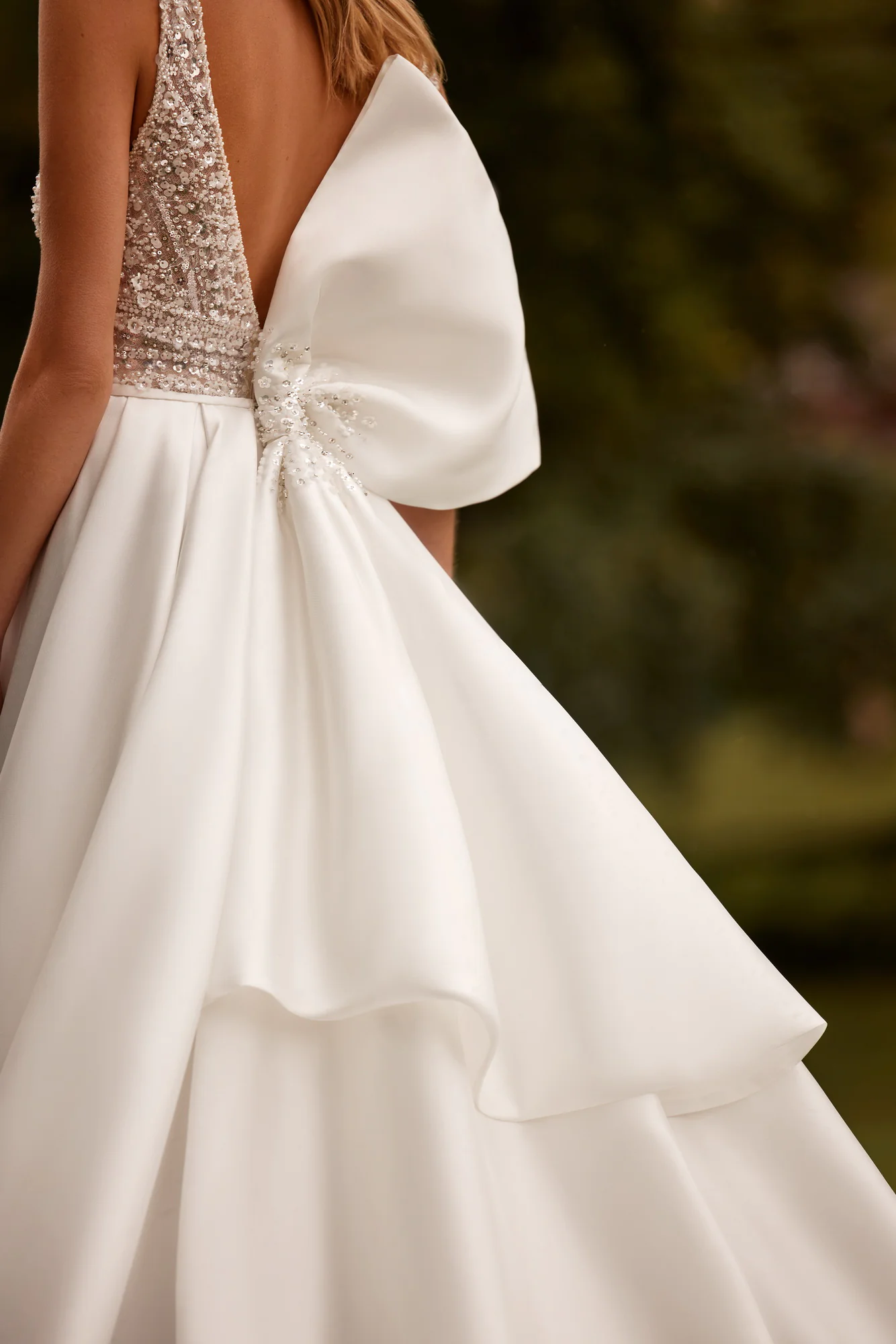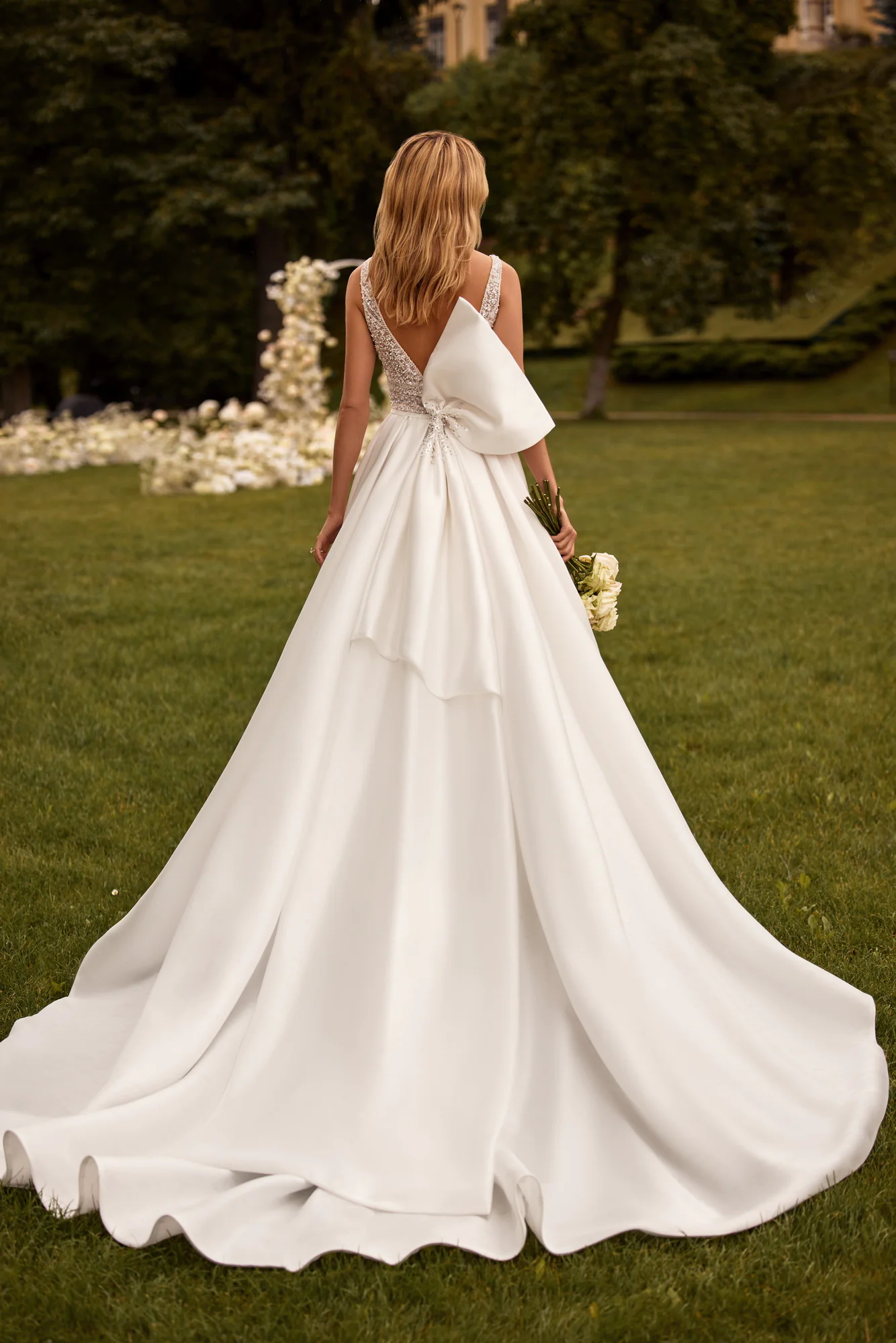 Dieses romantische A-Linien-Kleid besteht aus Spitze und glänzendem Stoff. Ein Mieder mit V-förmigem Ausschnitt ist mit Chantilly-Spitze verziert und von Hand mit dreidimensionalen Blumen, Pailletten und Perlen bestickt. Es gibt kleine Schnitte unter den Armen und einen tiefen Schnitt auf der Rückseite des Kleides. Es gibt einen Reißverschluss und die Taille wird durch einen Gürtel betont. Ein Rock mit Raffungen und einer Schleppe ist aus Mikado-Stoff gefertigt. Das Kleid ist mit einer Schleife aus dem gleichen Stoff verziert. Es ist mit Perlen, Pailletten und Perlen bestickt, lässt sich mit Knöpfen schließen und lässt sich leicht abnehmen.