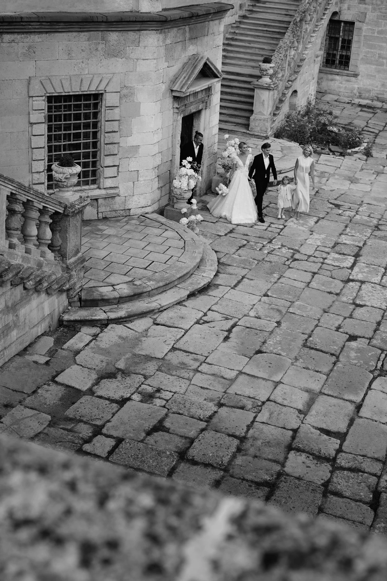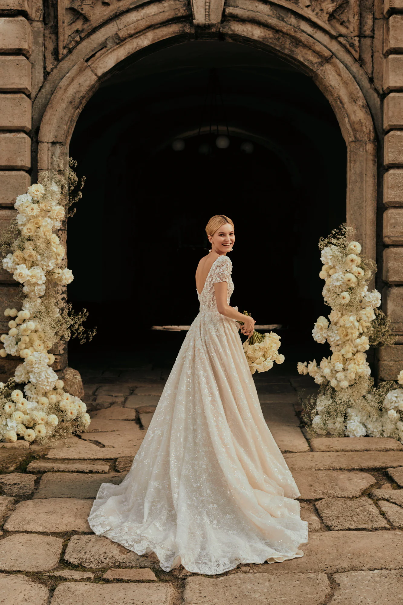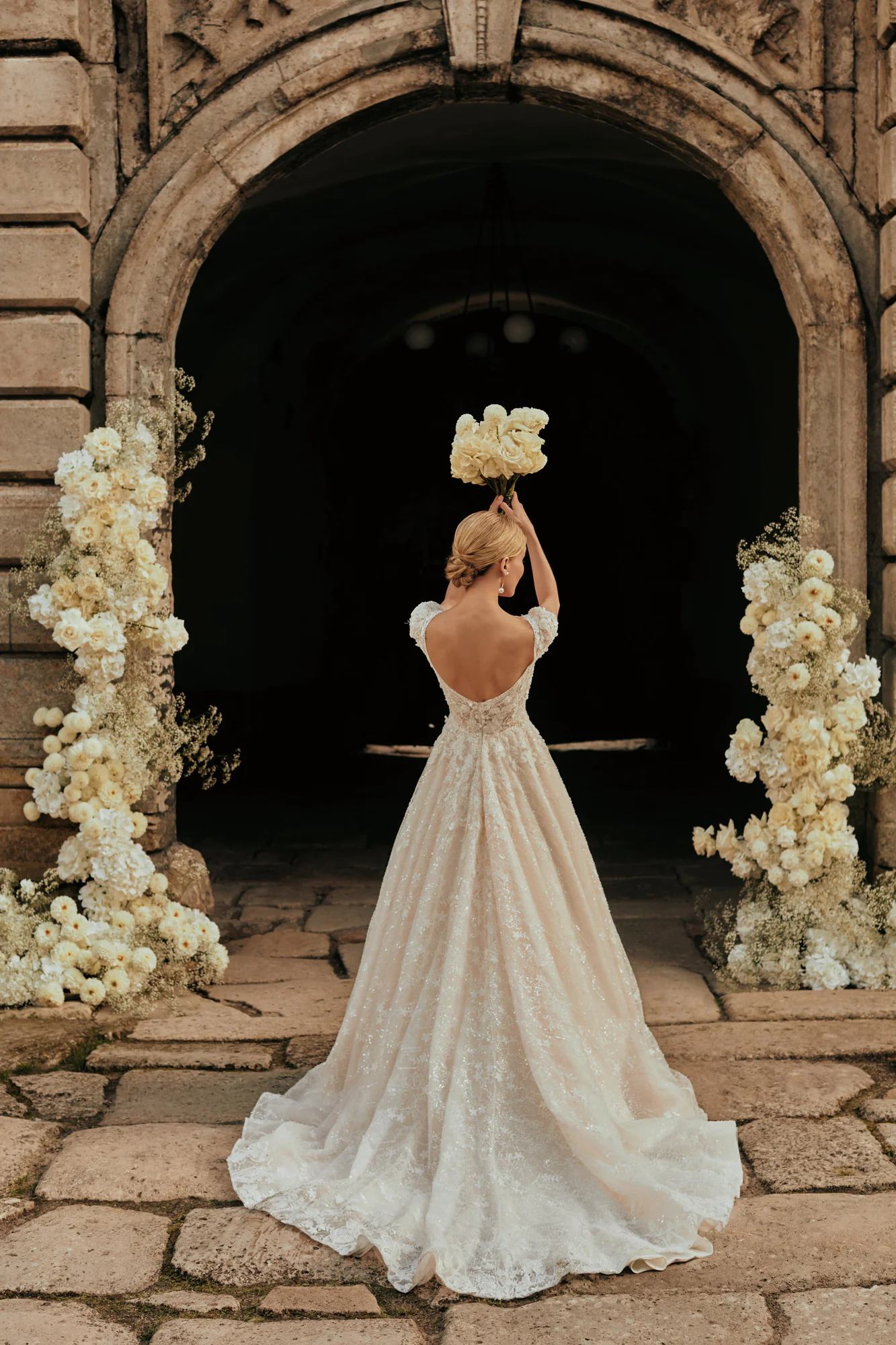 Ein zartes A-Linien-Kleid besteht aus zwei Arten transparenter Spitze. Ein Kleid mit V-förmigem Ausschnitt, das von Hand mit dreidimensionalen Blumen und Blättern bestickt wird. Die Taille wird durch einen abnehmbaren Netzgürtel betont. Es gibt kurze Ärmel, einen nackten Rücken und einen winzigen Reißverschluss. Ein Puffrock mit Spitzenblumen geht in eine mittellange Schleppe über.