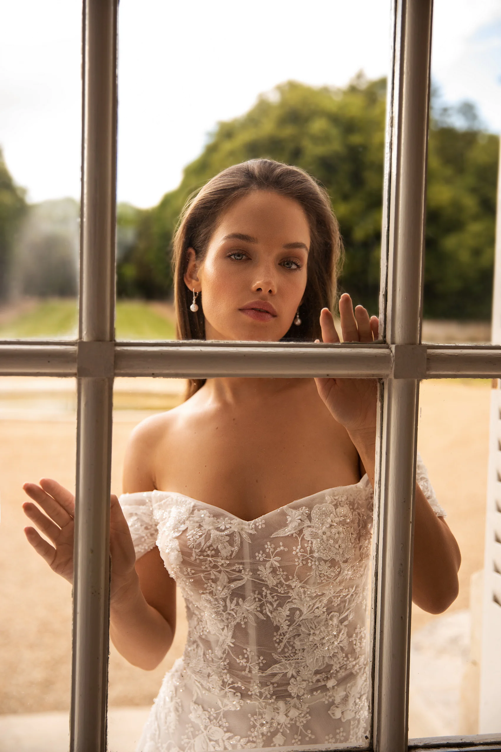 Das unglaublich zarte Kleid aus Perlenstoff ist über die gesamte Länge mit exquisiten Applikationen und Kristallen verziert. Das Korsett wird durch Innenkörbchen gestützt und die fallenden Ärmel verleihen ihm Leichtigkeit und Charme.