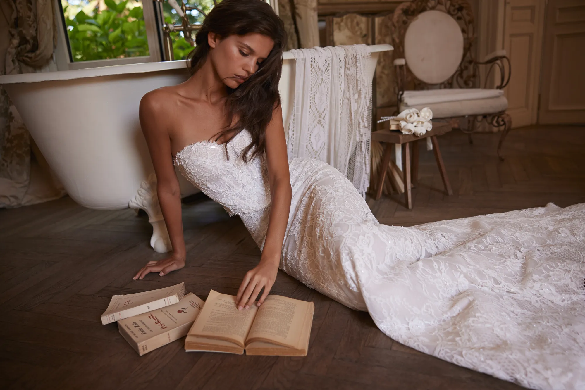 Das Kleid besteht aus nudefarbener Chantilly-Spitze. Das Herzausschnitt-Oberteil mit spitzer Taille und Schnürung am Rücken wird mit zwei austauschbaren Röcken kombiniert. Der erste ist ein eng anliegender nudefarbener Rock aus Chantilly-Spitze mit Perlenverzierung und Kordel. Der zweite ist ein voluminöser Rock aus elfenbeinfarbenem Tüll. Der Look kann mit abnehmbaren Details ergänzt werden – einem Bolero mit hohem Kragen und weiten Ärmeln im Boho-Stil oder abnehmbaren Chantilly-Spitzenärmeln.