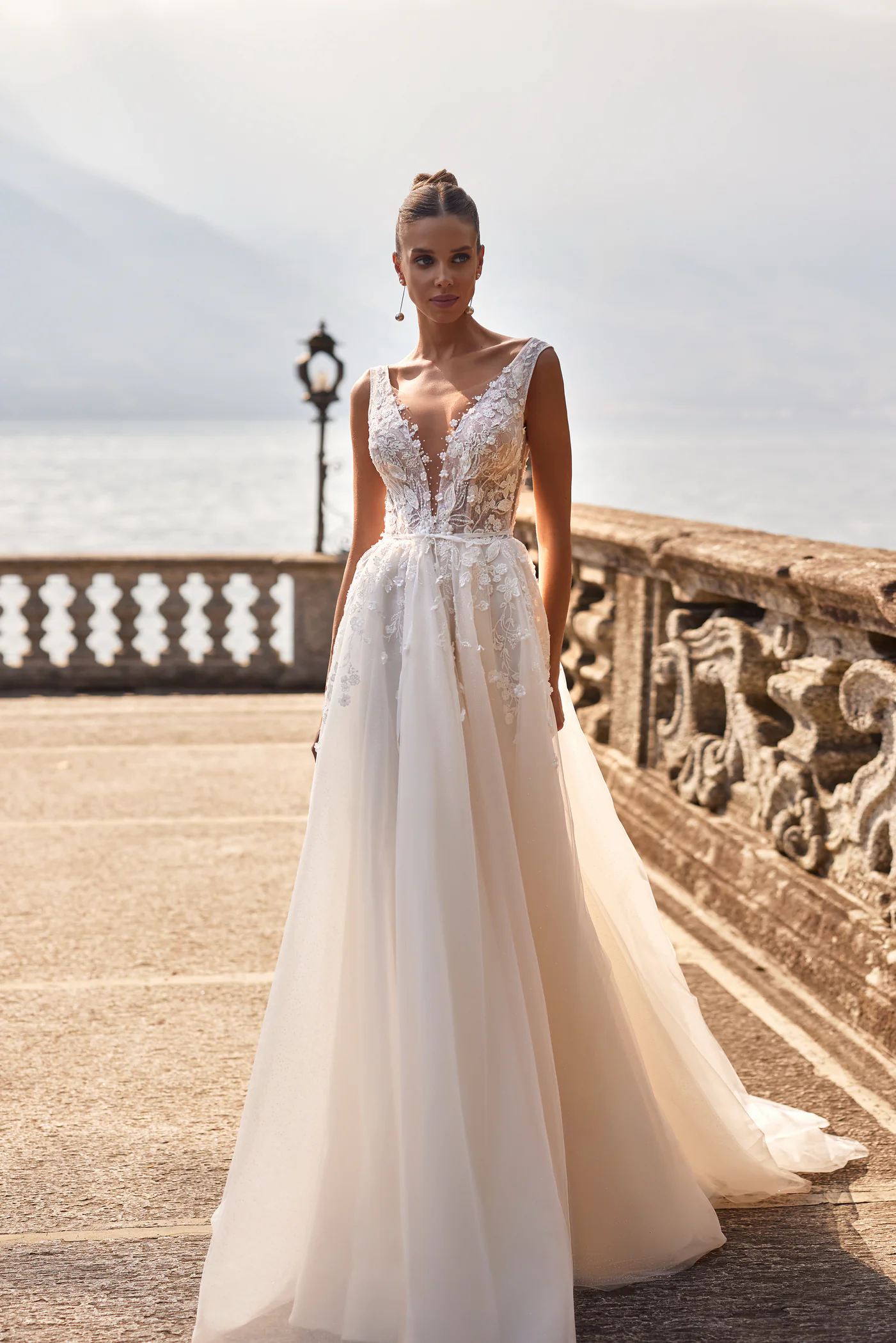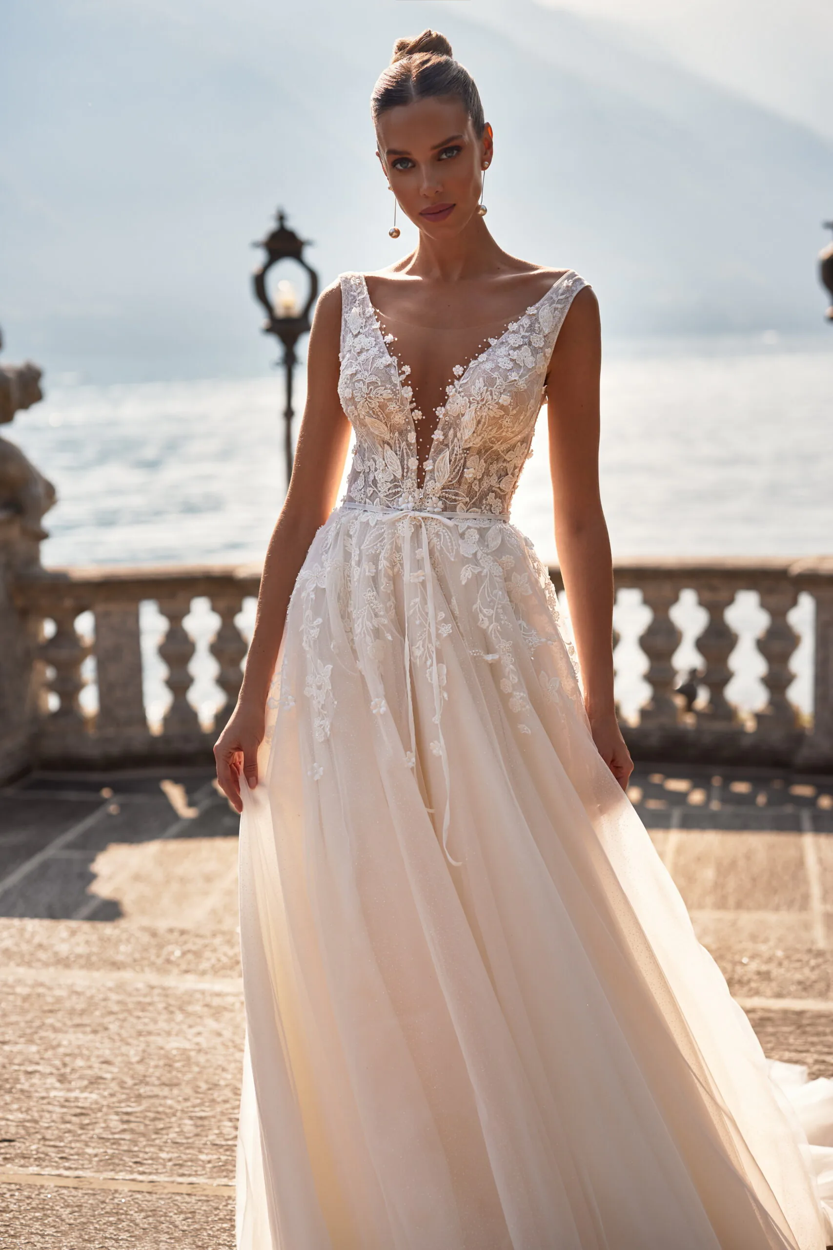 Ein nacktes Kleid in A-Linie besteht aus Chantilly-Spitze und Mesh. Ein Mieder mit V-förmigem Ausschnitt und breiten Trägern ist mit zwei Arten von Spitze und dreidimensionalen Blumen verziert. Ein Mieder ist manuell mit Perlen bestickt. Unter den Armen befinden sich Mesh-Einsätze und ein Reißverschluss. Ein tiefer U-förmiger Schnitt entblößt sanft den Rücken. Die Taille wird durch einen schmalen Gürtel mit Samtschleife betont. Der Rock besteht aus glänzendem Netzstoff und ist an der Hüfte mit Spitzeneinsätzen verziert. Es gibt einen langen Zug.