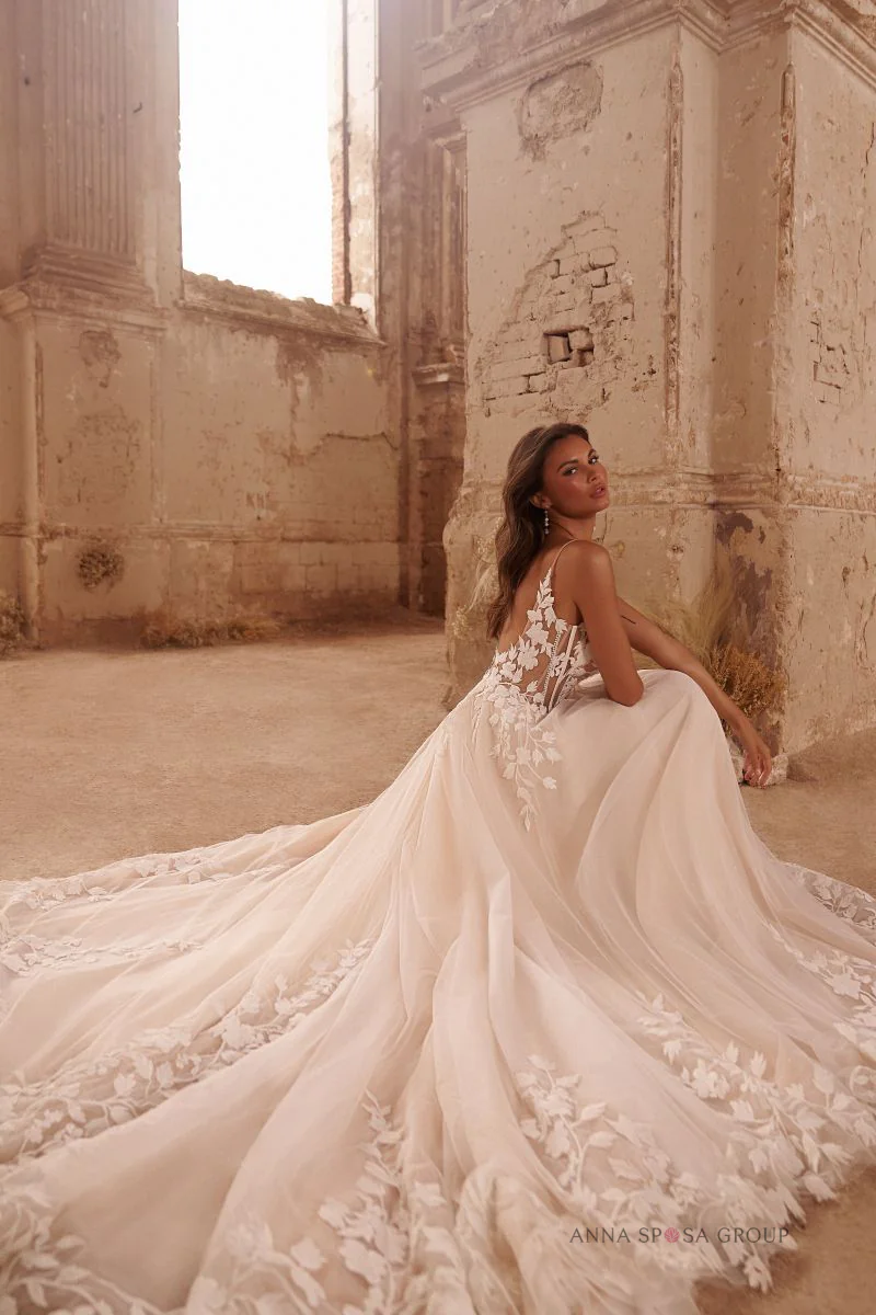 Akzente: romantisches A-Linien-Kleid mit dünnen Trägern. Das Oberteil des Kleides ist mit kontrastierender, matter Spitze im floralen Stil verziert und hat Einsätze aus durchscheinendem Netz. Der spektakuläre tiefe Ausschnitt und der offene Rücken machen das Bild sehr verführerisch und feminin, und der mehrlagige Rock, der großzügig mit Spitze verziert ist, fügt hinzu Zärtlichkeit und Romantik.