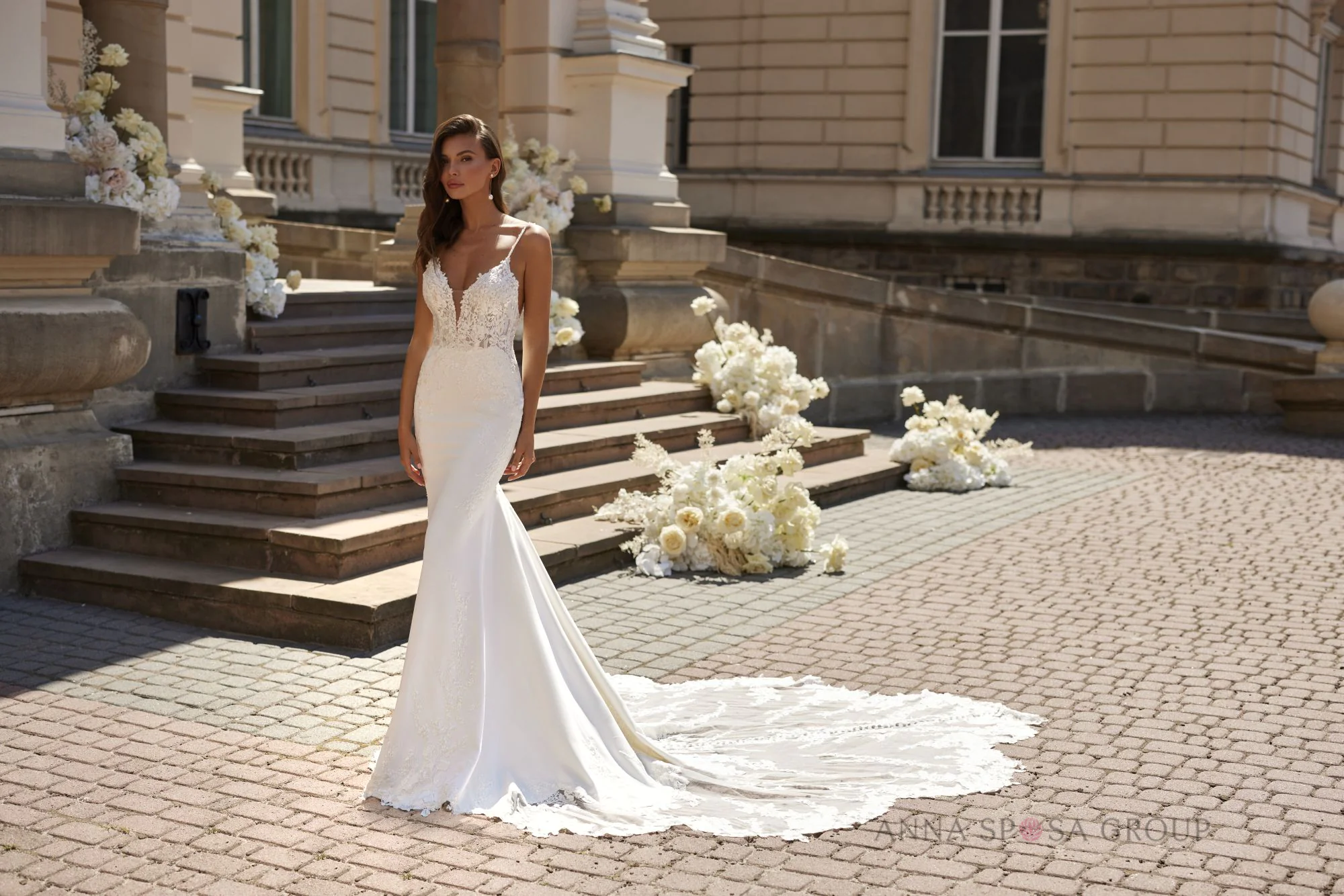 Akzente: elegantes, tailliertes Kleid mit langer Spitzenschleppe. Großzügig mit mattierter Blumenspitze verziert. Ein tiefer V-Ausschnitt mit nacktem Mesh-Einsatz, ein offener Rücken und dünne Träger betonen die Zerbrechlichkeit der Braut und sorgen für einen spektakulären und femininen Look.