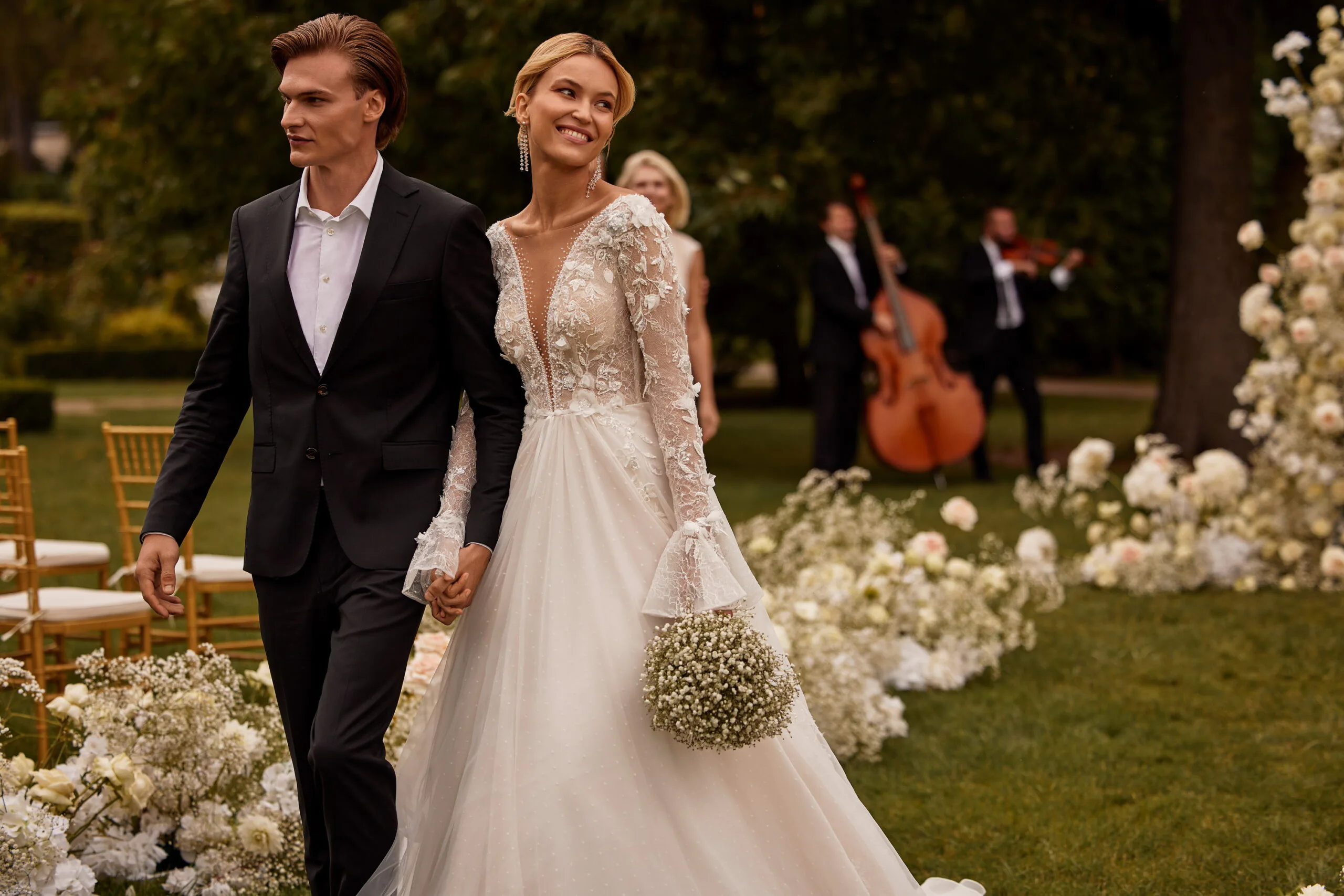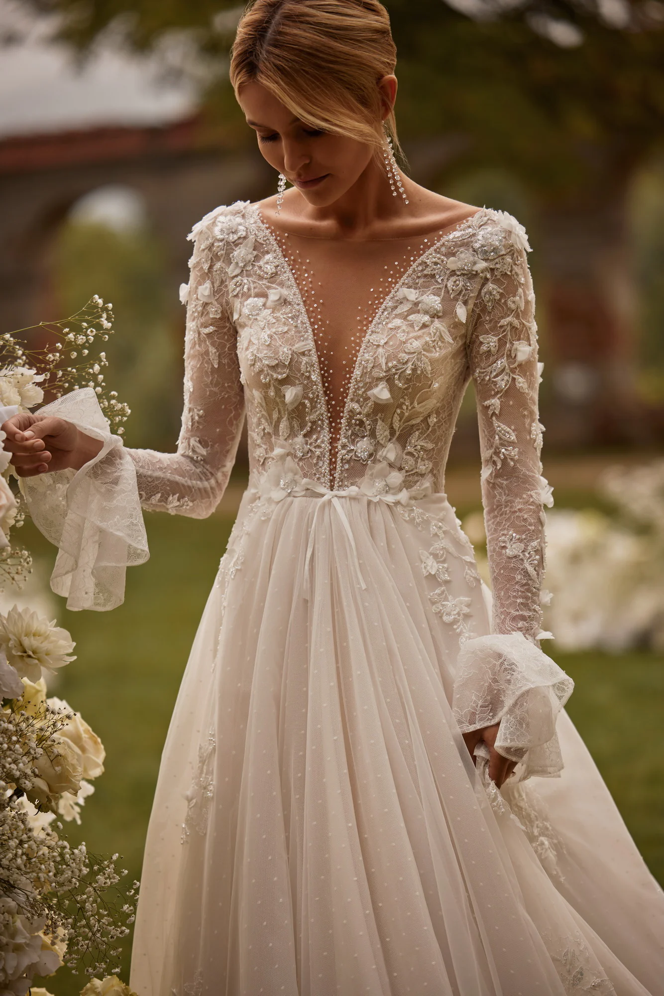 Ein exquisites Kleid in A-Linie mit Spitze und Blumen ist aus gepunktetem Netzstoff und Chantilly-Spitze gefertigt. Ein Spitzenmieder mit tiefem Ausschnitt ist von Hand mit dreidimensionalen Blumen, Perlen und Pailletten bestickt. Die Ärmel sind mit Rüschen verziert. Auf der Rückseite des Kleides befindet sich ein U-förmiger Ausschnitt und ein Reißverschluss. Die Taille wird durch eine kleine Samtschleife betont. Ein Puffrock ist ebenfalls mit Blumen verziert. Es gibt einen kleinen Zug.