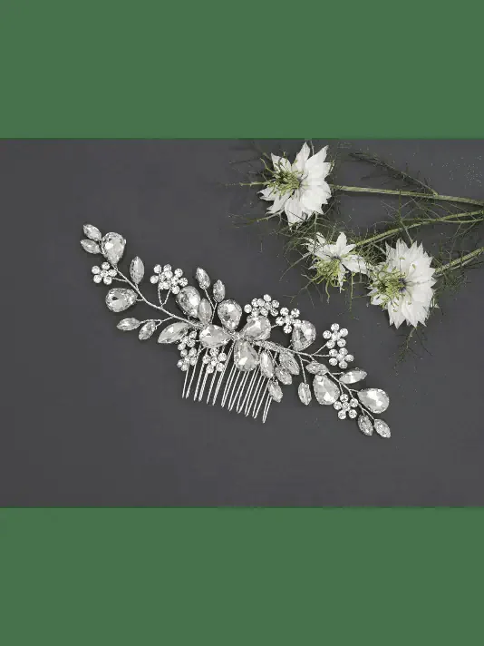 Dieser wunderschöne Brauthaarkamm ist mit schimmernden Strasssteinen. Der Kamm mit Blumen und Blättern ist silberfarben. Dieses exquisite Accessoire wird den letzten Schliff für die perfekte Hochzeit vervollständigen und ist nickel- und bleifrei. Der Kamm lässt sich leicht in Ihre Brautfrisur einfügen. Die Größe des Haarkamms beträgt 16 x 5,4 cm.