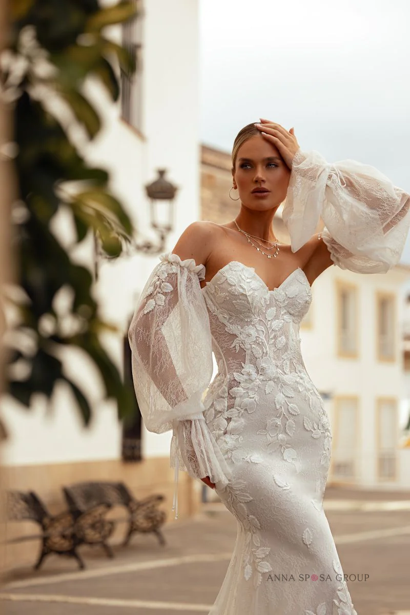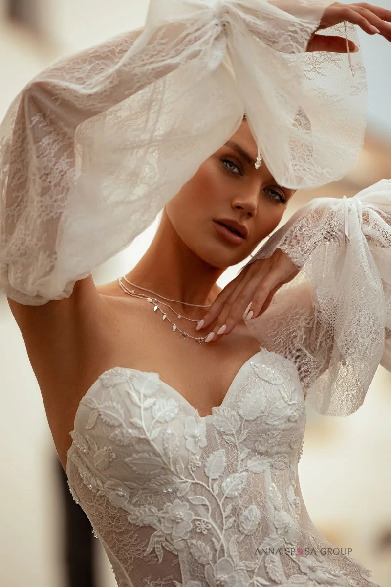 Akzente: ein luxuriöses, tailliertes Kleid, das die Figur perfekt betont, mit einer langen, spektakulären Schleppe. Das Kleid ist großzügig mit floraler, voluminöser Spitze verziert, die mit Perlen und Pailletten bestickt ist. Üppige abnehmbare Ärmel aus dünner, zarter Spitze ergänzen den Look und machen ihn noch spektakulärer.
