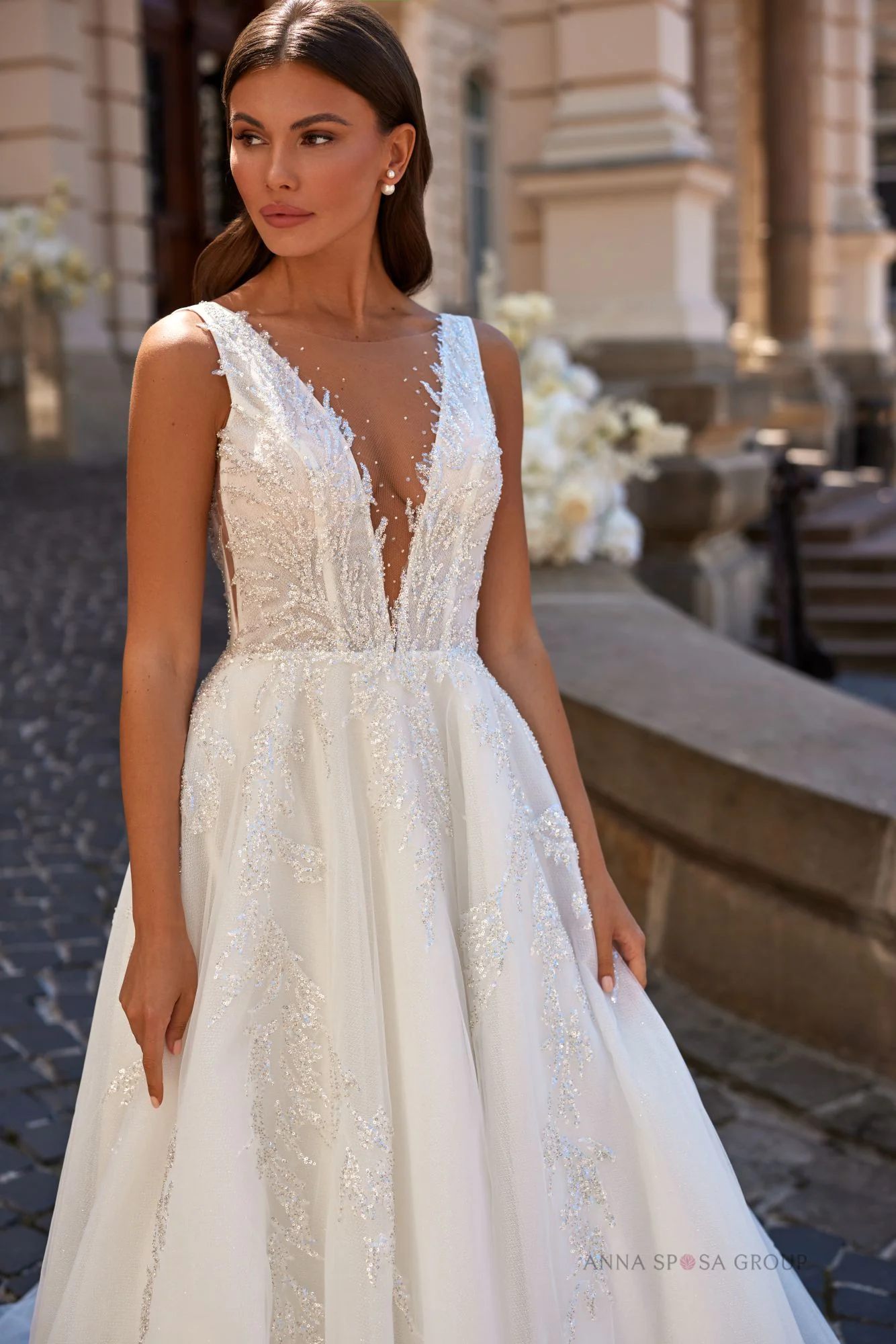 Akzente: atemberaubendes Kleid mit langer, spektakulärer Schleppe. Aufwendig mit Perlen und Pailletten besetzt, mit hautfarbenem Mesh-Einsatz am Ausschnitt. Ein offener Rücken und eine Halskette im Hintergrund runden den Look ab und verleihen ihm ein Gefühl von Weiblichkeit.