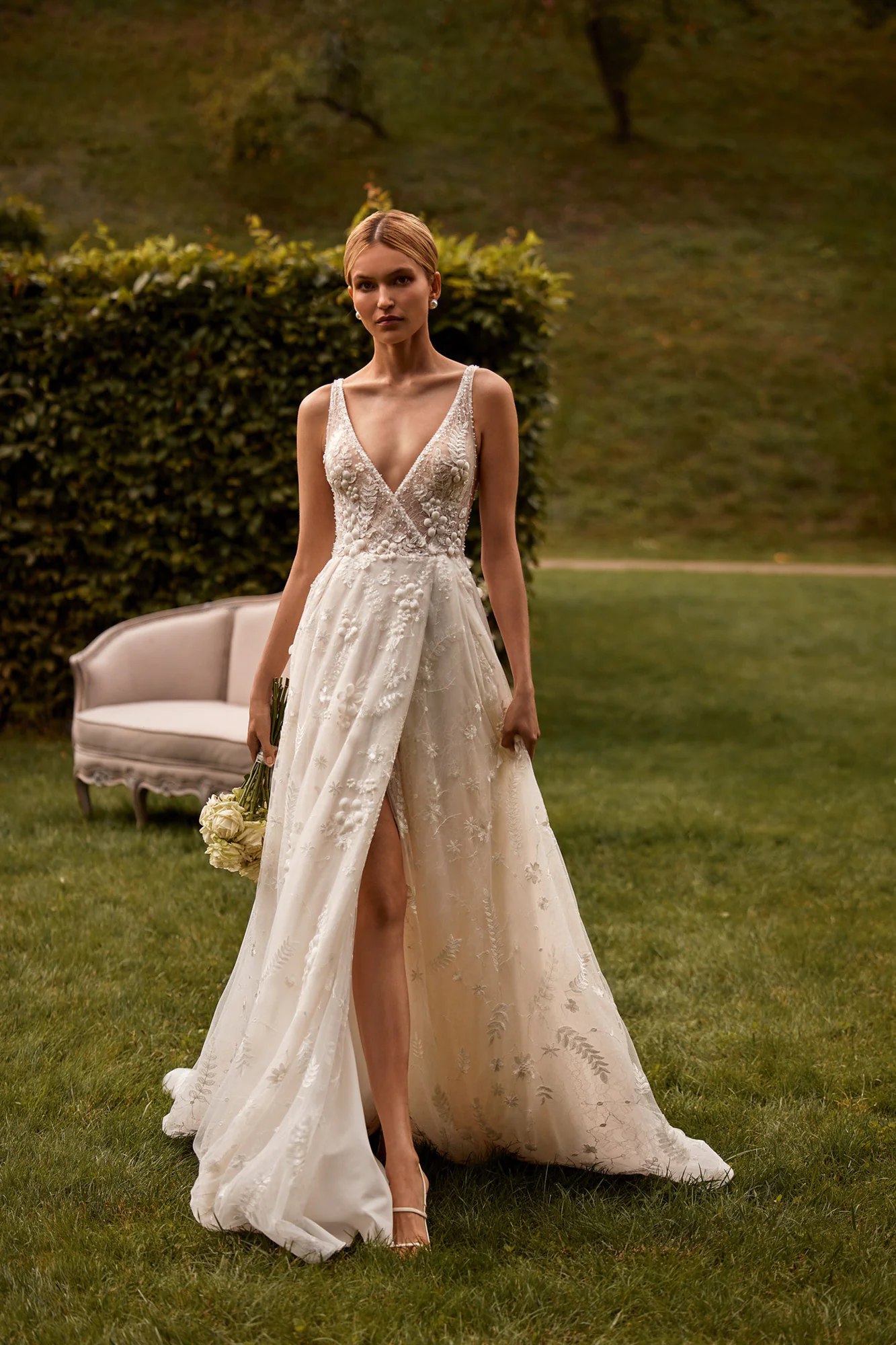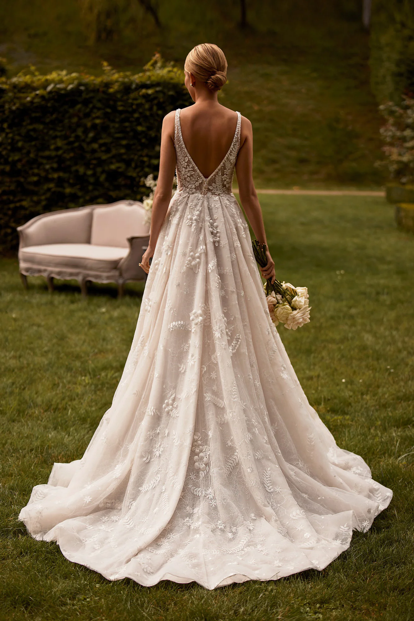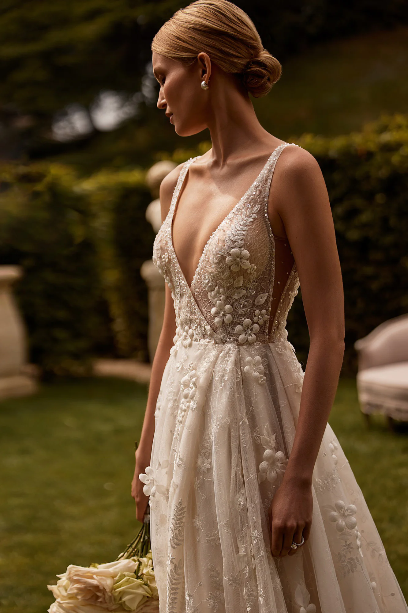 Ein Wickelkleid mit hohem Schnitt besteht aus transparenter Spitze und Einsätzen aus Chantilly-Spitze. Ein V-förmiges Oberteil ist mit dreidimensionalen Blumen, Blättern, Perlen, Pailletten und Kristallen verziert. Das Kleid ist mit Schnitten unter den Armen und einem tiefen Ausschnitt auf der Rückseite des Kleides verziert. Ein Puffrock ist ebenfalls mit Blumen und Blättern verziert. Es gibt einen Zug.