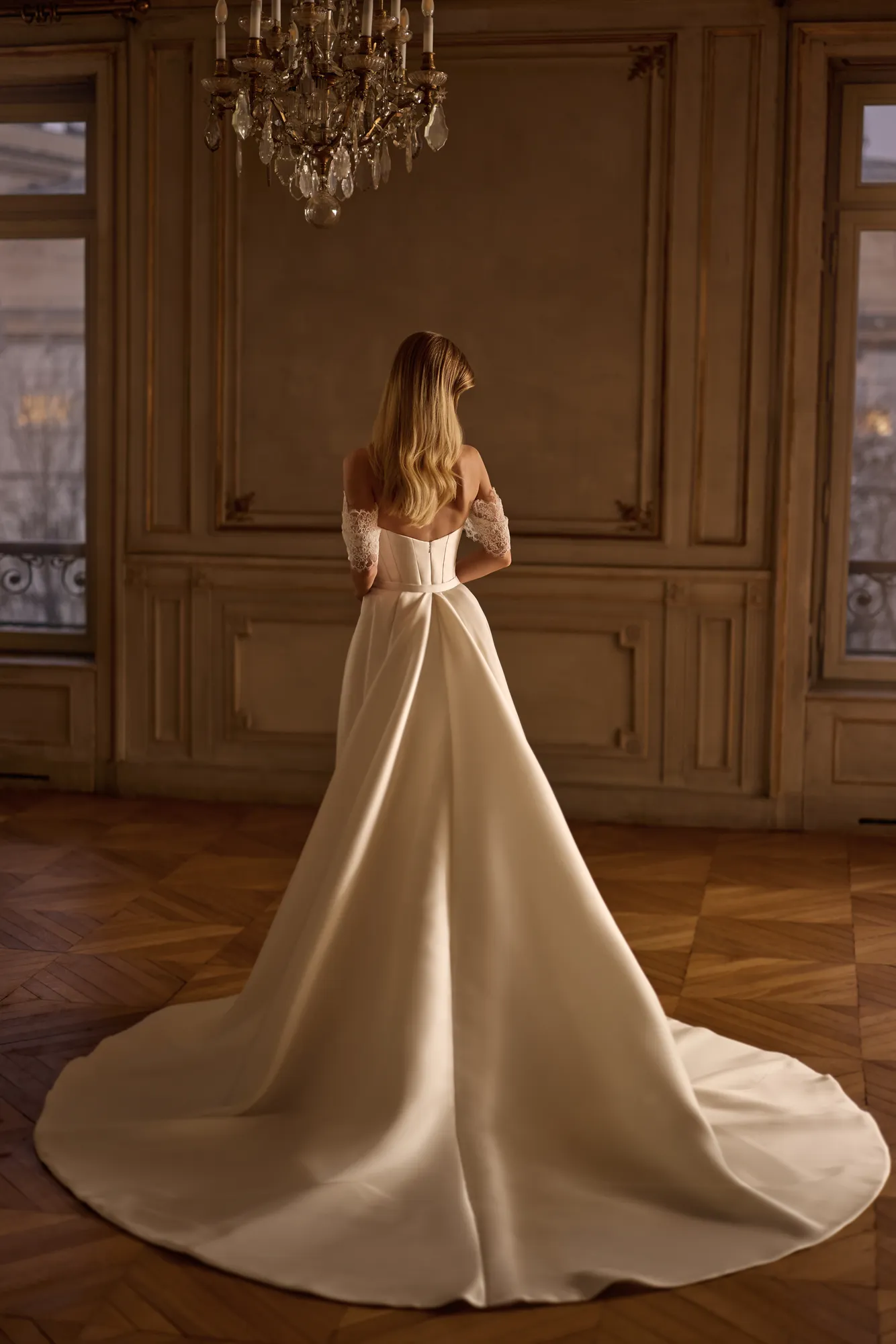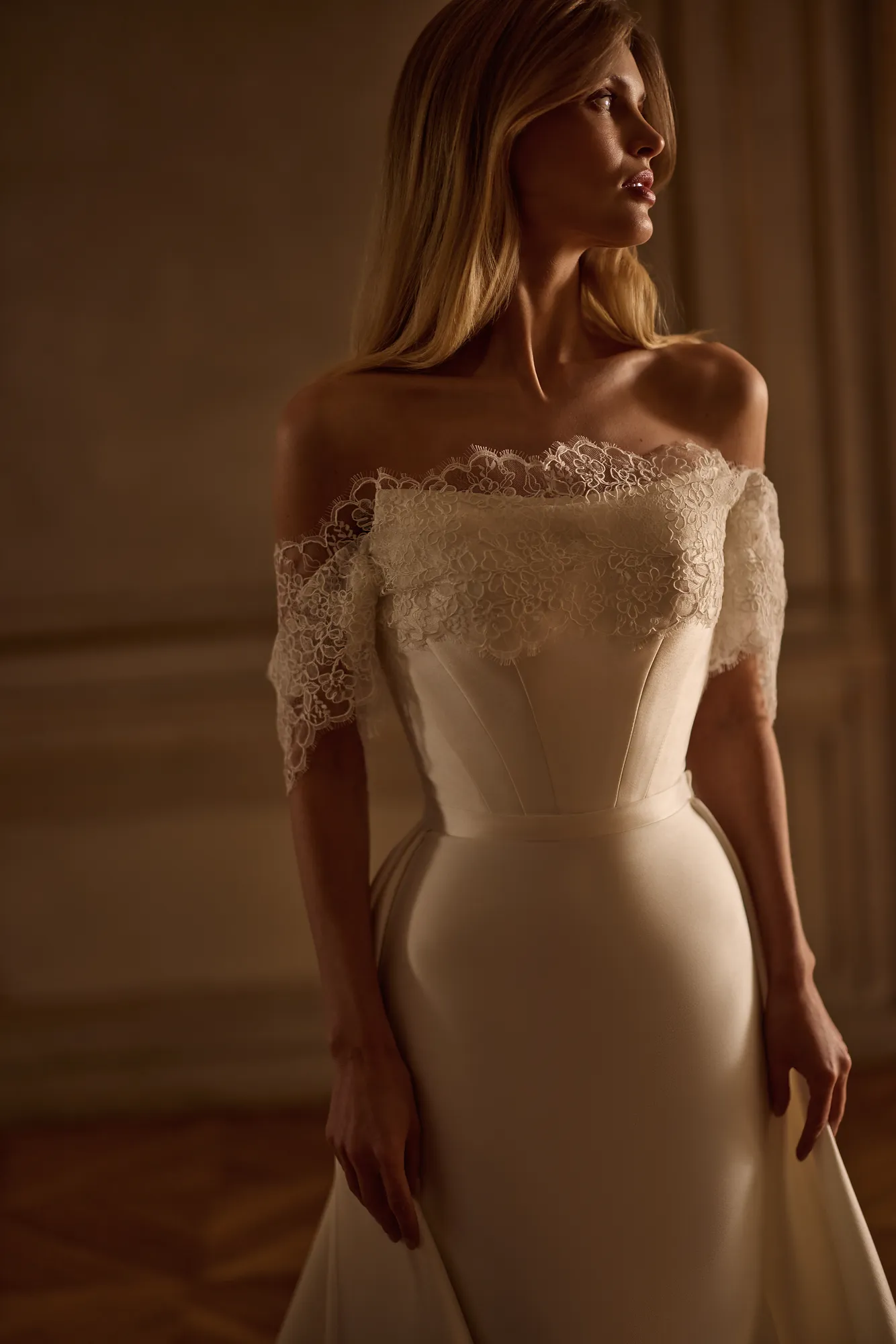 Ein minimalistisches Fit & Flare Kleid aus Mikado-Stoff. Das figurbetonte Oberteil wird mit einem abnehmbaren kurzen Bolero aus Chantilly-Spitze mit Schulterausschnitt kombiniert. Der Rücken ist mit einer Schnürung und einem Reißverschluss versehen. Der Rock umspielt elegant die Figur und fließt in eine Schleppe über. Der Look kann zusätzlich mit einer langen Schleppe ergänzt werden, die an der Taille befestigt wird.