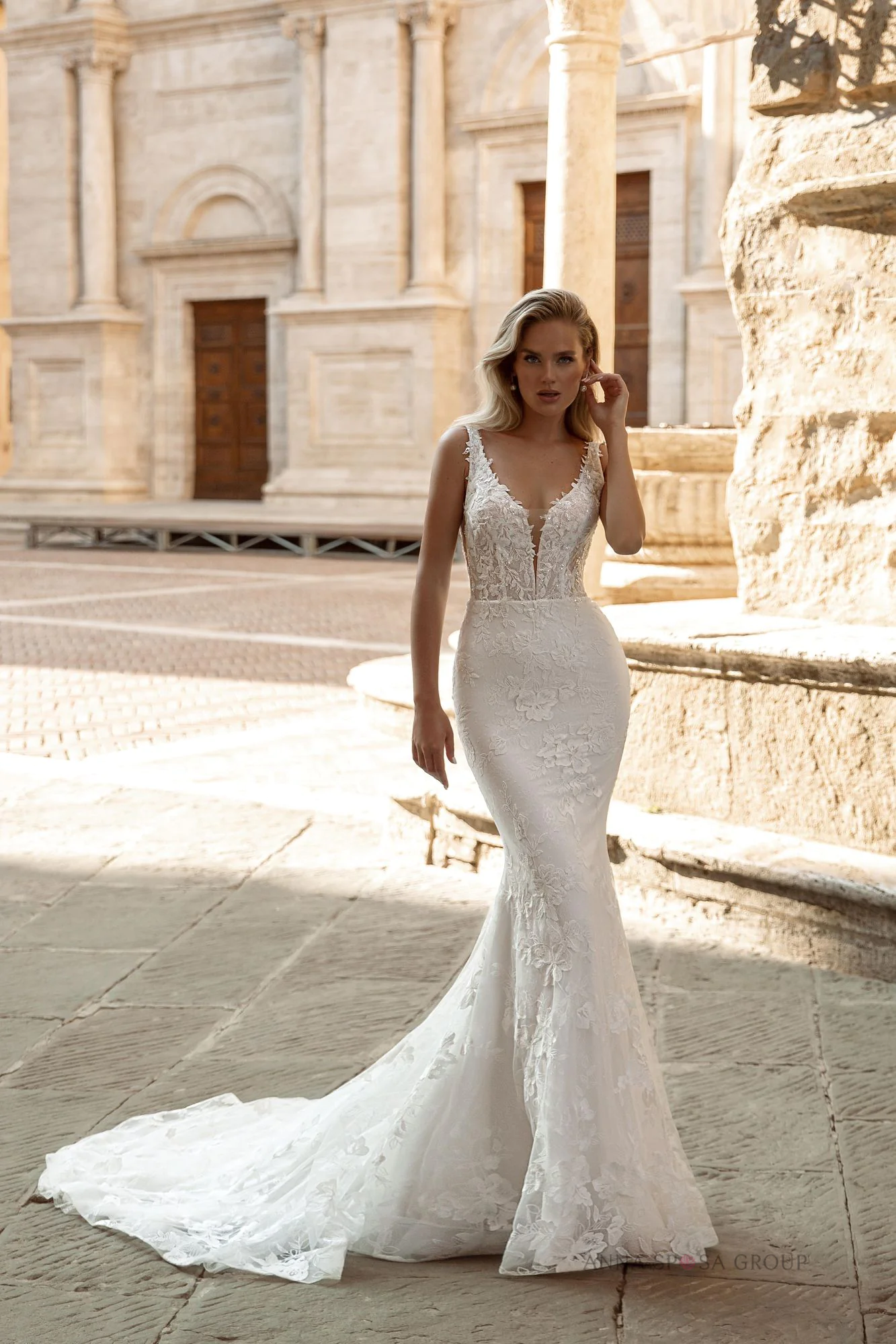 Akzente: ein elegantes, tailliertes Kleid mit Trägern und langer Schleppe. Das Kleid ist großzügig mit floraler, matter Spitze bestickt und mit Perlen und Pailletten verziert. Das Oberteil hat einen V-förmigen Einsatz aus durchscheinendem Mesh, der das Dekolleté betont, und der tiefe Rücken macht den Look verführerischer.