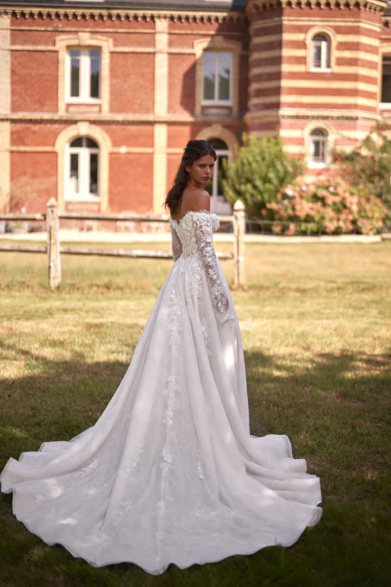 Ein romantisches Kleid in A-Linie aus zarter nudefarbener Chantilly-Spitze. Das Oberteil mit geformten Cups und Herzausschnitt hat schulterfreie lange Ärmel. Auf der Rückseite des Kleides befinden sich ein Reißverschluss und eine innere Schnürung. Das Oberteil ist von Hand mit Spitze, dreidimensionalen Blumen, Pailletten, Perlen und Kristallen verziert. Der Rock mit hohem Schlitz ist ebenfalls mit Spitzenblumen verziert und fließt in eine lange Schleppe über.
