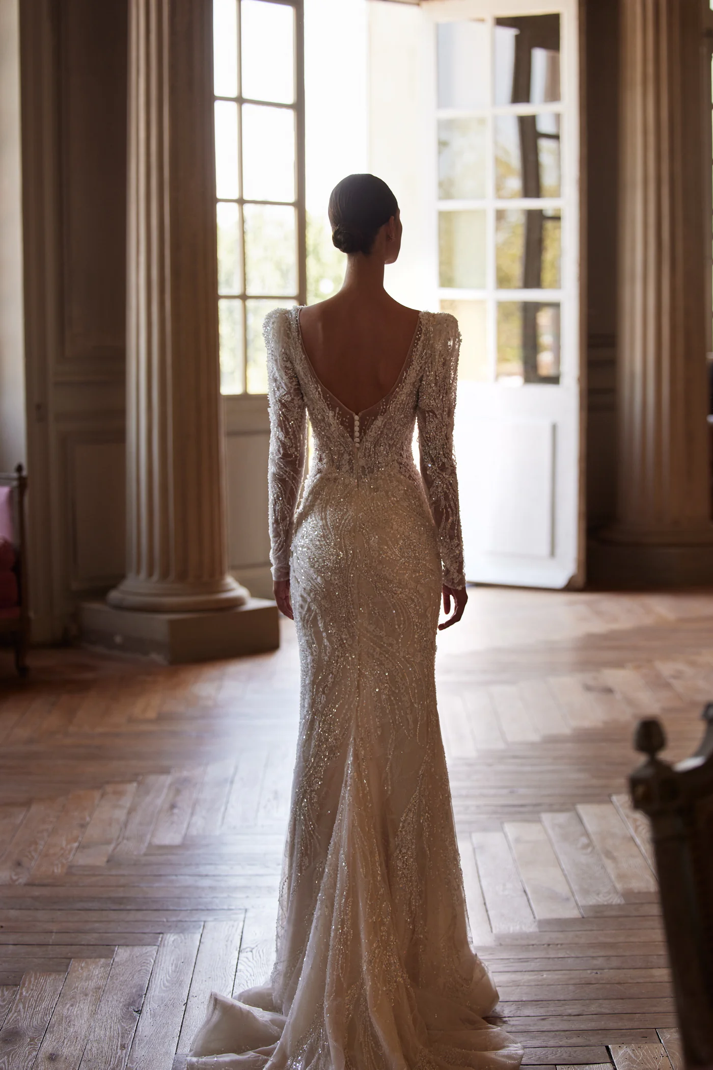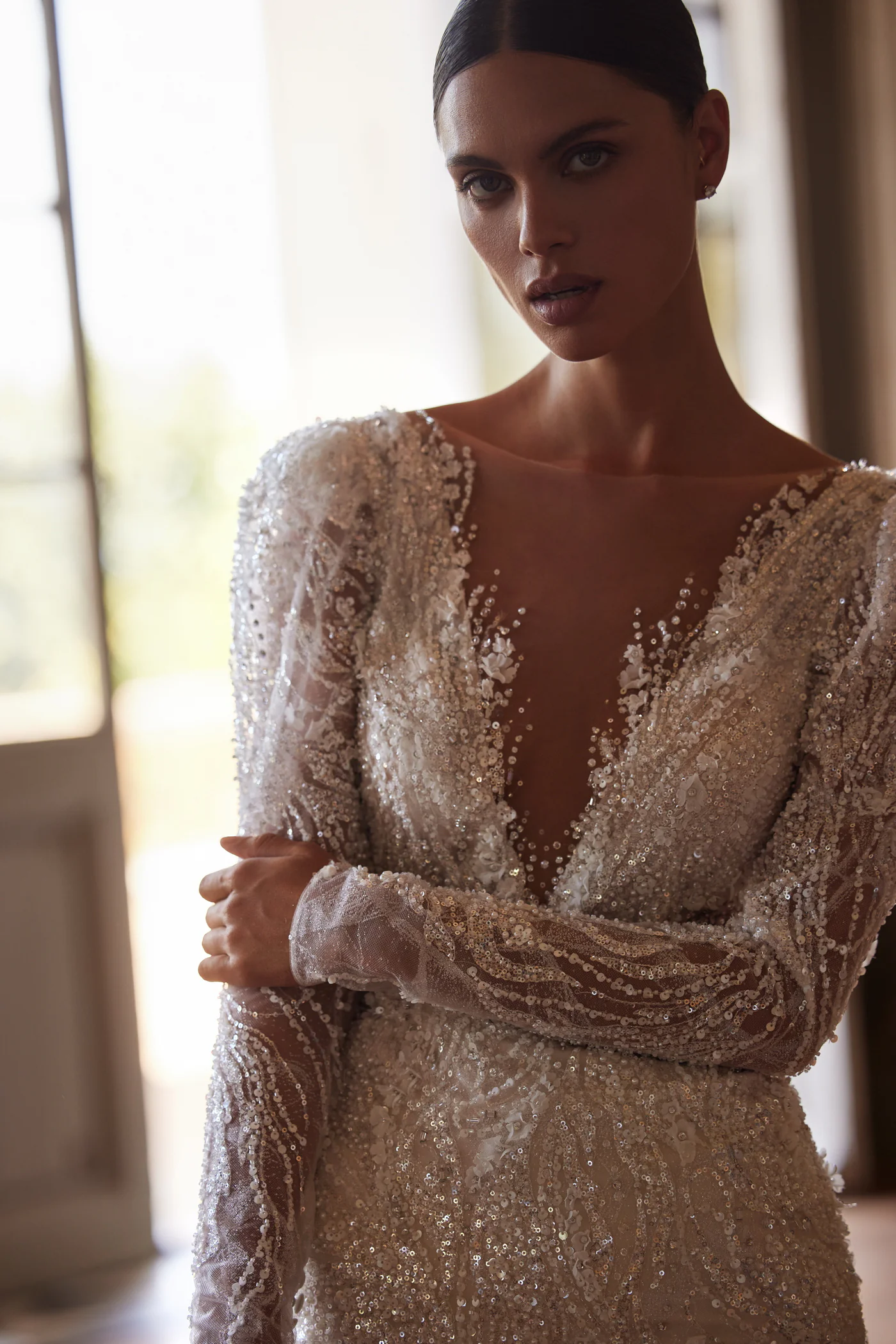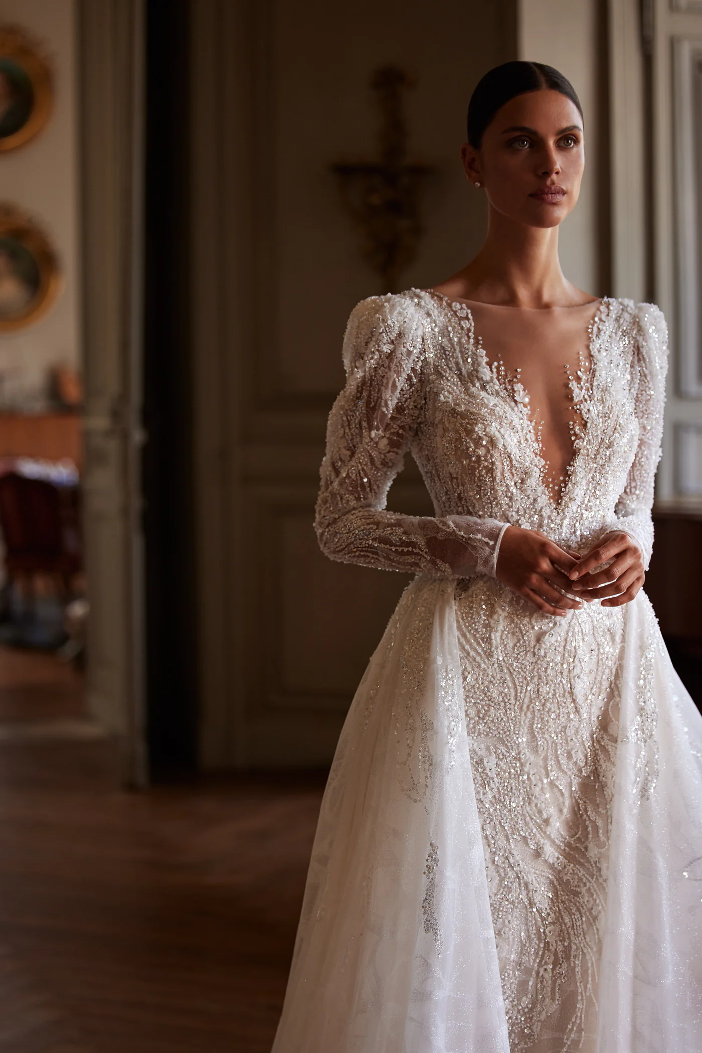 Ein exquisites Fischschwanz-Brautkleid ist ein wahres Symbol der Romantik. Das Kleid besteht aus luxuriöser Perlenspitze und schimmerndem Glitzer an der Basis. Ein Korsett mit tiefem V-Ausschnitt und langen Ärmeln wird mit einem Reißverschluss und Knöpfen geschlossen. Das Kleid ist mit handgefertigter Stickerei aus Kristall, Steinen, Perlen, Perlen und 3D-Blumen verziert.